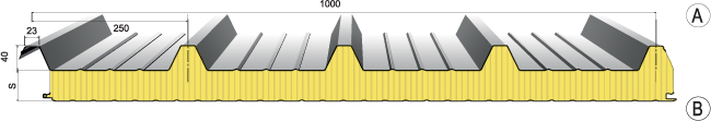 realizzato mediante uno strato di coibente di speciale configurazione, in fibre minerali ad alta densità (λ = 0,040 W/mK), disposte perpendicolarmente al piano delle lamiere.